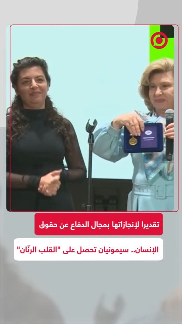 تقديرا لإنجازاتها البارزة بمجال الدفاع عن حقوق الإنسان.. المفوضة الروسية لحقوق الإنسان تاتيانا موسكالكوفا، تمنح رئيسة تحرير قناة RT مارغريتا سيمونيان، جائزة للدفاع عن حقوق الإنسان وحرياته مصحوبة بهدية تذكارية تحمل اسم "القلب الرنان".