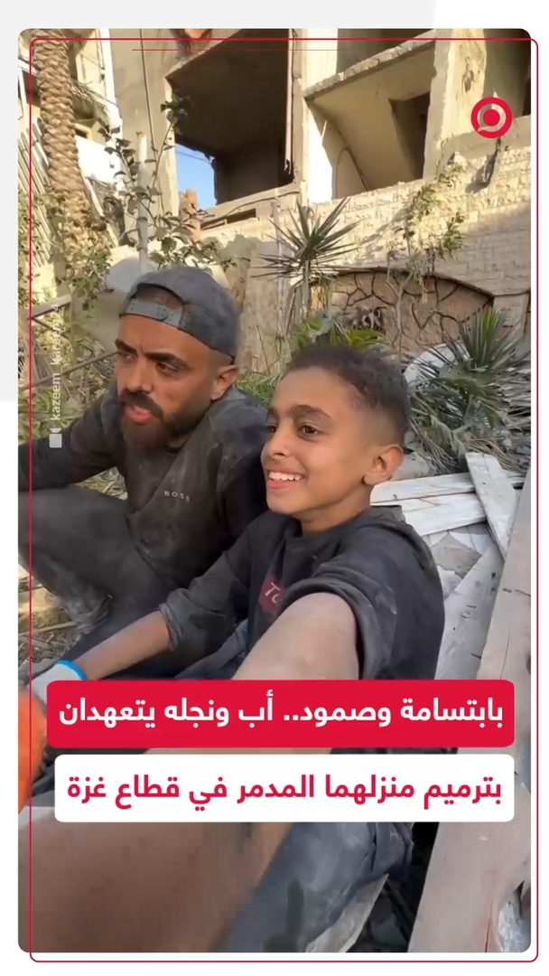 مشهد مؤثر بروح فكاهية.. أب فلسطيني ونجله يتعهدان بإعادة بناء منزلهما المدمر في قطاع غزة مستخدمَين أسلوب "ترند" شهير على مواقع التواصل. #ترميم #منزل #غزة #ترند #فيديو #Viral #اكسبلور