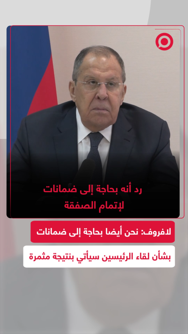 "نحن أيضا بحاجة إلى ضمانات بشأن أن لقاء الرئيسين سيأتي بنتيجة مثمرة".. وزير الخارجية الروسي سيرغي لافروف، يؤكد أن بلاده تنتظر تأكيدا من الولايات المتحدة بشأن المقترحات التي قدمها الممثل الخاص للرئيس الأمريكي ستيف ويتكوف خلال المحادثات في الأسكا.