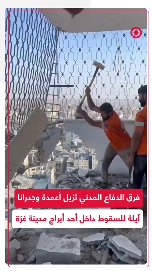 الدفاع المدني الفلسطيني يزيل جدرانا مهددة بالانهيار داخل أحد الأبراج شمالي قطاع غزة