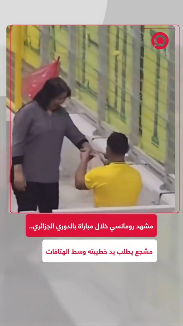 ملعب حسين آيت أحمد في مدينة تيزي وزو بالجزائر شهد لحظة غير معتادة خلال مباراة من البطولة الجزائرية، حيث تقدّم أحد المشجعين وطلب يد خطيبته وسط هتافات وتصفيق الجمهور، في مشهد لفت الأنظار وتحول إلى حديث المدرجات.