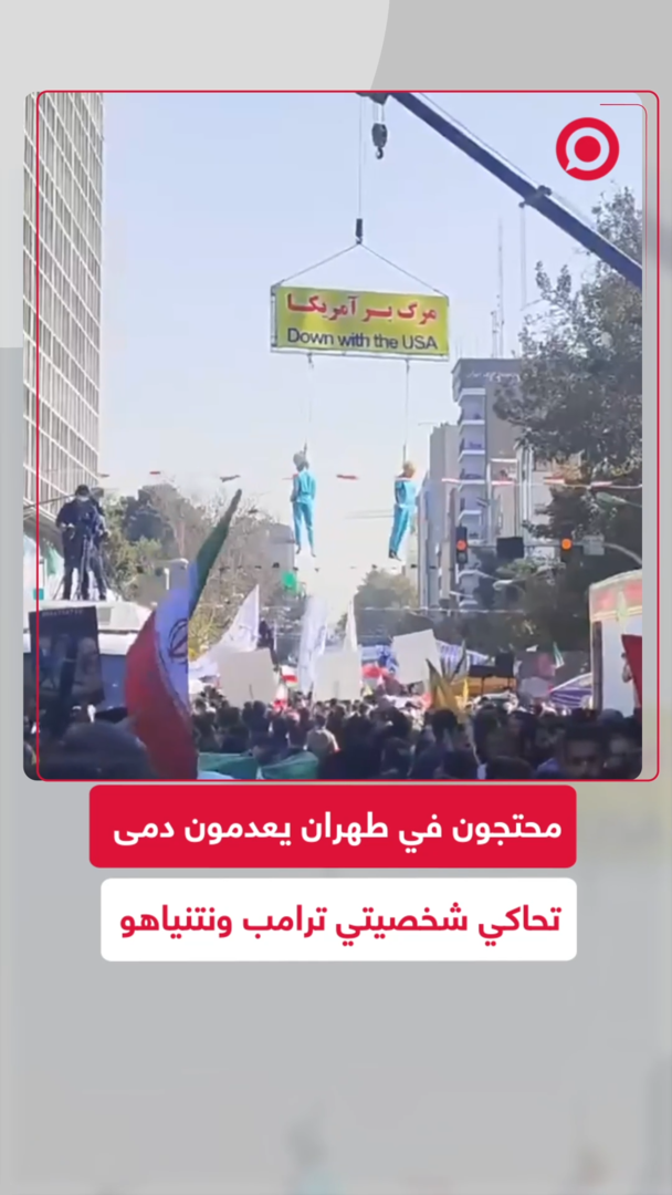 محتجون في طهران يعلقون دميتين بشكل ترامب ونتنياهو فوق رافعة!