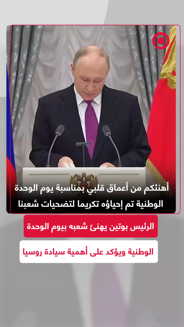الرئيس فلاديمير بوتين يهنئ الشعب الروسي بمناسبة يوم الوحدة الوطنية، مشيرا إلى أن هذه المناسبة تم إحياؤها تكريما لتضحيات الشعب الذي دافع عن استقلال وطنه قبل أكثر من أربعة قرون. وشدّد بوتين على أن وحدة الروس وتحملهم المسؤولية وولاءهم مهد لتعزيز أسس الدولة وحماية حقها في التمسك بجذورها وقيمها الأخلاقية.ِ #بوتين #يوم_الوحدة_الوطنية #روسيا #وحدة_الشعب #سيادة