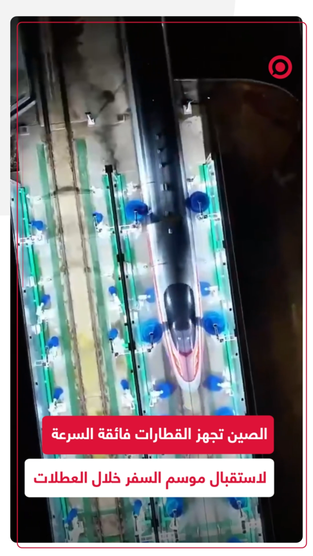 مشاهد من أعمال تجهيز وصيانة القطارات فائقة السرعة في الصين مع اقتراب انطلاق موسم "تشونيون"، حيث تقوم آلات غسل آلية بتنظيف القطارات بالكامل خلال 5 دقائق. #الصين #قطارات #فيديو #تشون_يون