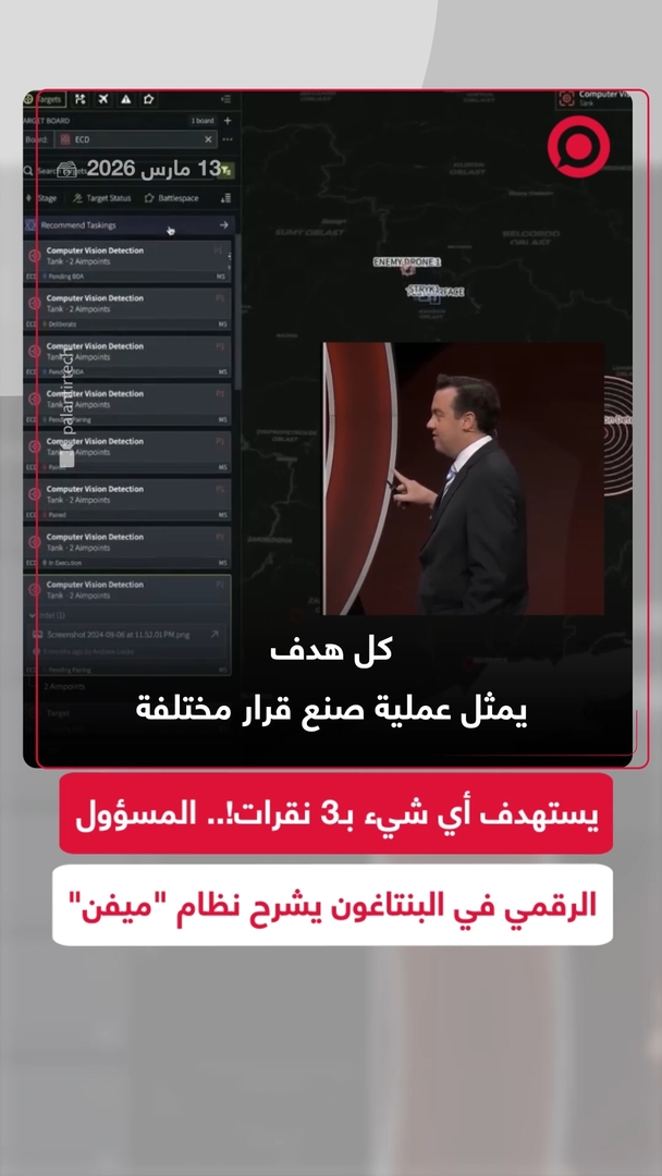 وسط تقارير عن استخدامه في الحرب على إيران.. المسؤول الرقمي ورئيس الذكاء الاصطناعي في وزارة الحرب الأمريكية كاميرون ستانلي، استعرض خلال مؤتمر تقني نظام "ميفن" المطوّر من شركة "بالانتير"، وشَرَح آلية عمله في تحديد الأهداف عبر 3 نقرات فقط. #ذكاء_اصطناعي #ميفن #ريل #فيديو #viral #اكسبلور