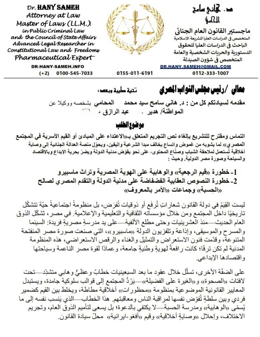 تقدّم هاني سامح محامي البلوغر المصرية هدير عبد الرازق اليوم بطلب التماس ومقترح إلى مجلس النواب يطالب فيه بإلغاء عبارة الاعتداء على المبادئ أو القيم الأسرية في المجتمع المصري.