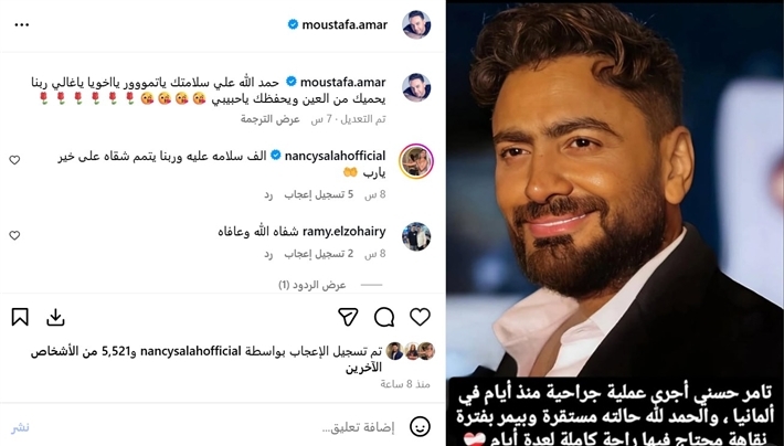 ونشر مصطفى قمر صورة لتامر حسني مكتوب عليها: "تامر حسني أجرى عملية جراحية منذ أيام في ألمانيا، وحالته مستقرة وبيمر بفترة نقاهة محتاج فيها راحة كاملة لعدة أيام.