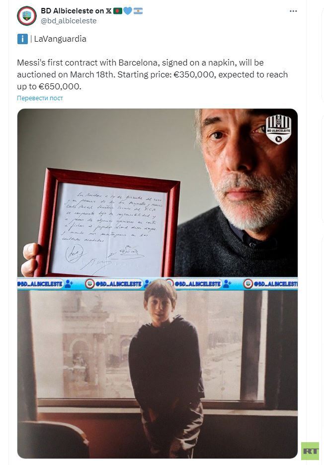 وتم إبرام عقد رسمي لاحقا، بين ليونيل ميسي وبرشلونة، لكن الوكيل الأرجنتيني جاجيولي احتفظ بهذا الإثبات الأولي للاتفاقية منذ 25 عاما تقريبا، الذي قرر بيعه في المزاد.
