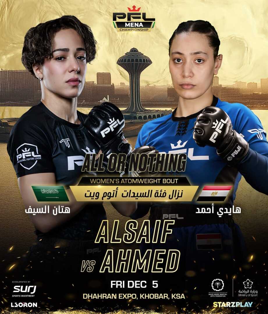وتواجه السيف في هذا النزال المرتقب المقرر إقامته في مدينة الخبر يوم 5 ديسمبر المقبل المقاتلة المصرية هايدي أحمد، في مواجهة عربية تحمل طابعا خاصا كونها تجمع بين بطلتين شقتا طريقهما من بطولات الهواة إلى عالم الاحتراف.