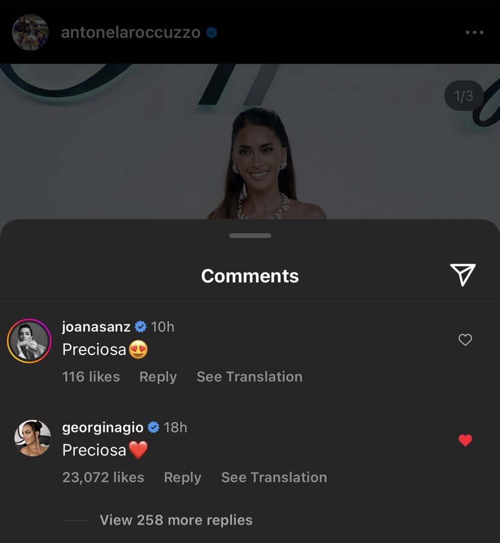 وردت جورجينا سريعا على صورة لأنتونيلا وكتبت كلمة "Preciosa" وهي من الكلمات الإسبانية التي تحمل دلالة المودة والتقدير.