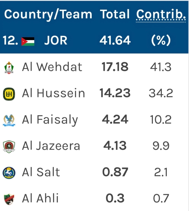 وبلغ مجموع النقاط التراكمية للأندية الأردنية 41.643 نقطة، توزعت على النحو التالي: