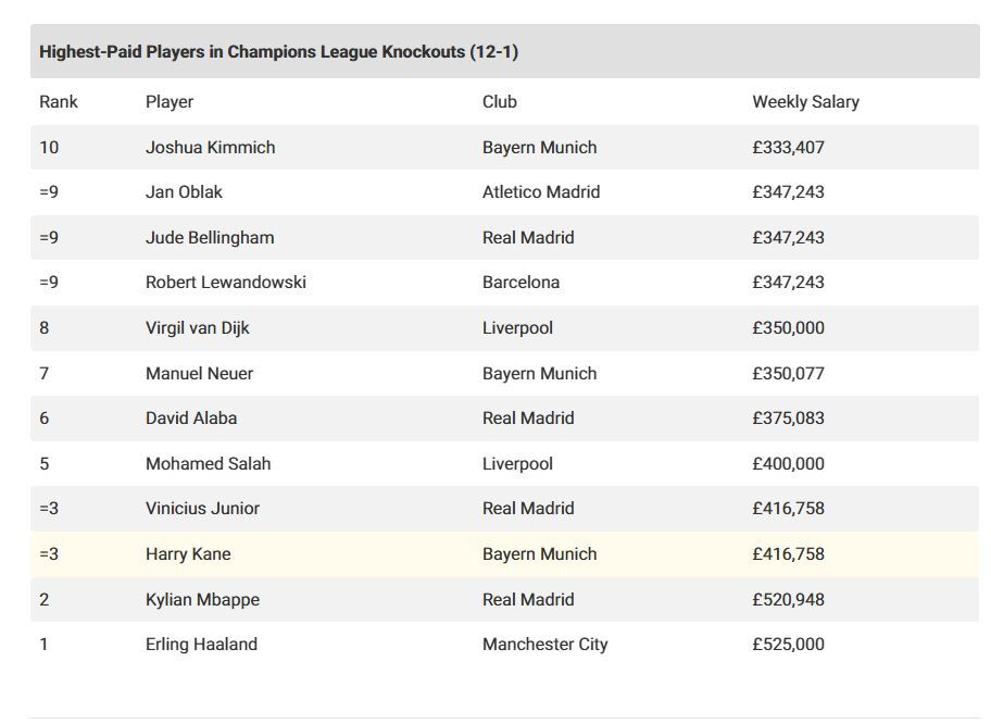وتصدر النجم النرويجي إيرلينغ هالاند هداف فريق مانشستر سيتي الإنجليزي قائمة أعلى اللاعبين أجرا في الدور ثمن النهائي لدوري أبطال أوروبا لكرة القدم، حيث يتقاضى راتبا أسبوعيا يصل إلى 525 ألف جنيه إسترليني، ويليه الفرنسي كيليان مبابي مهاجم فريق ريال مدريد الإسباني برصيد 520 ألف جنيه إسترليني أسبوعيا، وفقا لشبكة Givemesport البريطانية.