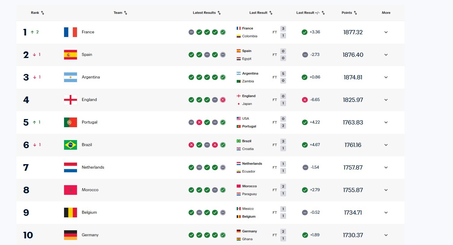 أما منتخب الأرجنتين، حامل لقب كأس العالم، فتراجع للمركز الثالث رغم فوزه الكبير على زامبيا بخماسية نظيفة في حين حافظت إنجلترا على مركزها الرابع دون تغيير.