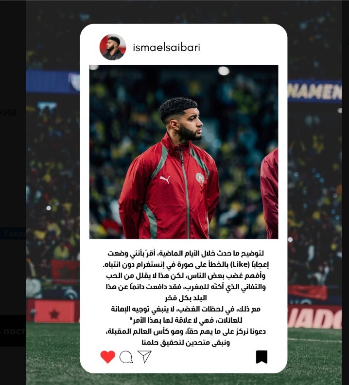 فقد كتب إسماعيل الصيباري، لاعب وسط أيندهوفن الهولندي، عبر حسابه على "إنستغرام": "قمت عن طريق الخطأ بالإعجاب بصورة على إنستغرام من دون الانتباه. أتفهم غضب بعض الأشخاص، لكن ذلك لا ينقص شيئا من الحب والولاء اللذين أكنهما للمغرب. لقد دافعت دائما عن هذا البلد بكل فخر"، داعيا إلى التركيز على الاستحقاق المقبل وهو كأس العالم.