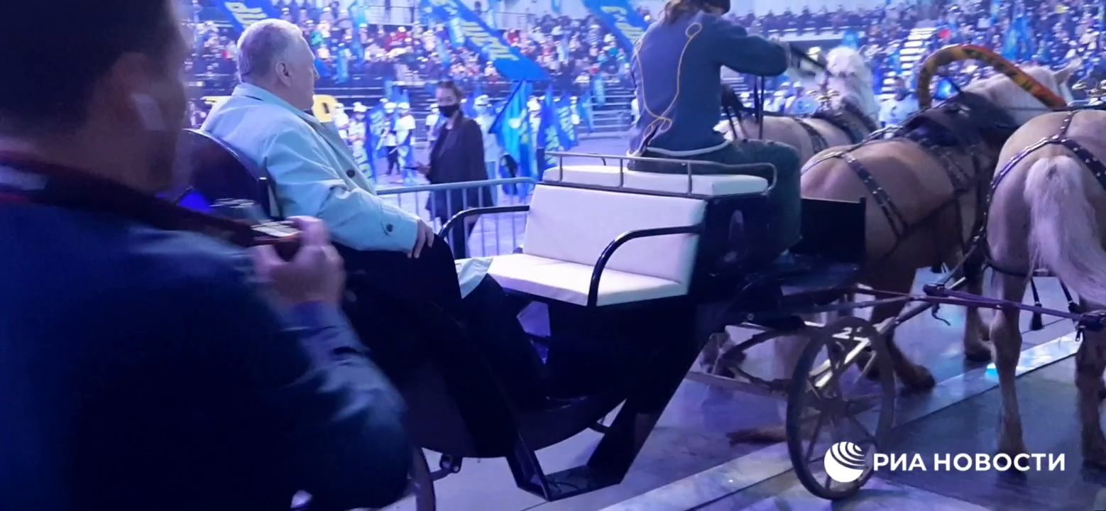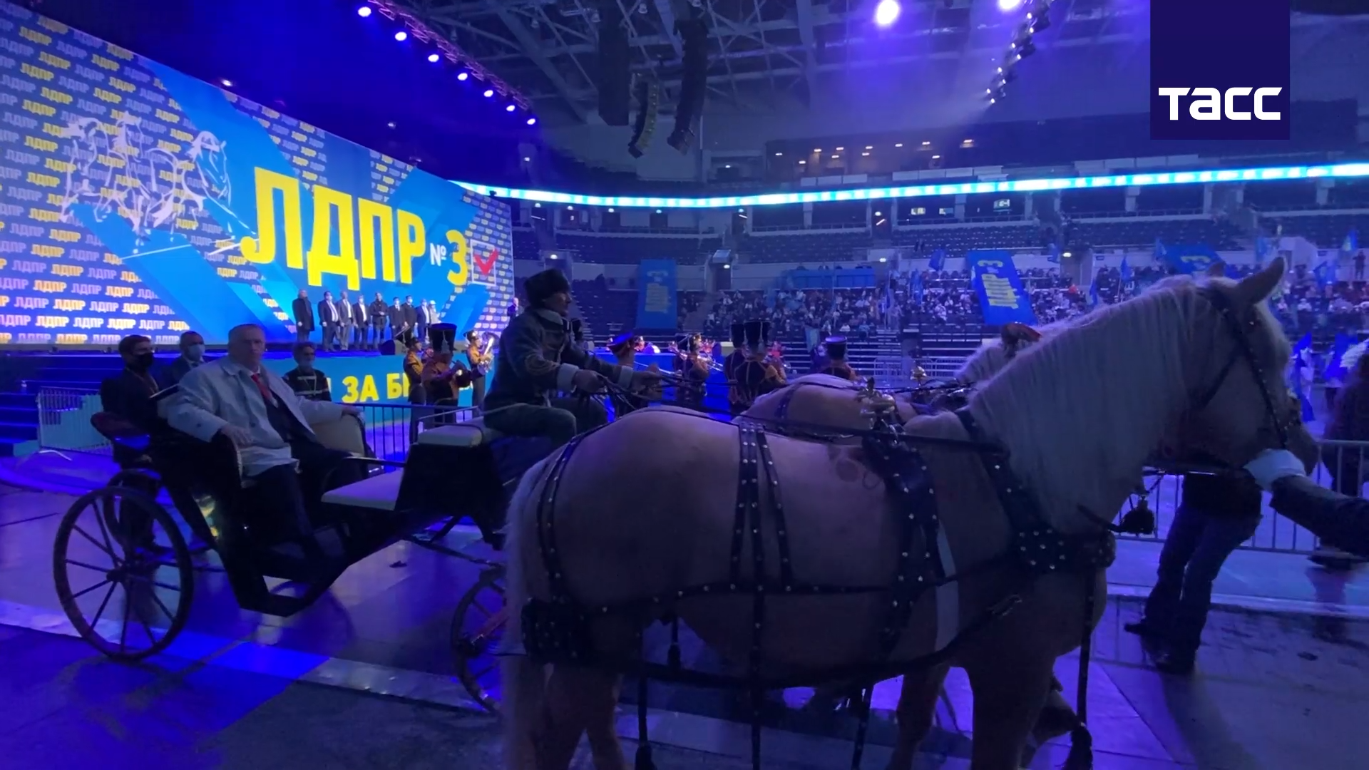 وصل رئيس الحزب الليبرالي في روسيا فلاديمير جيرونوفسكي على عربة تجرها ثلاثة من الخيول إلا أنها جفلت بسبب تلويح أعضاء الحزب بالأعلام.