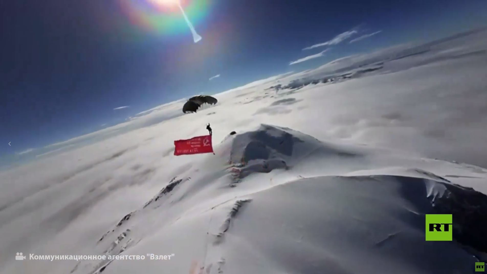 - وأخيرًا التحليق بمظلة شراعية من أعلى منطقة فوق سطح الأرض مع رأية النصر السوفيتية.