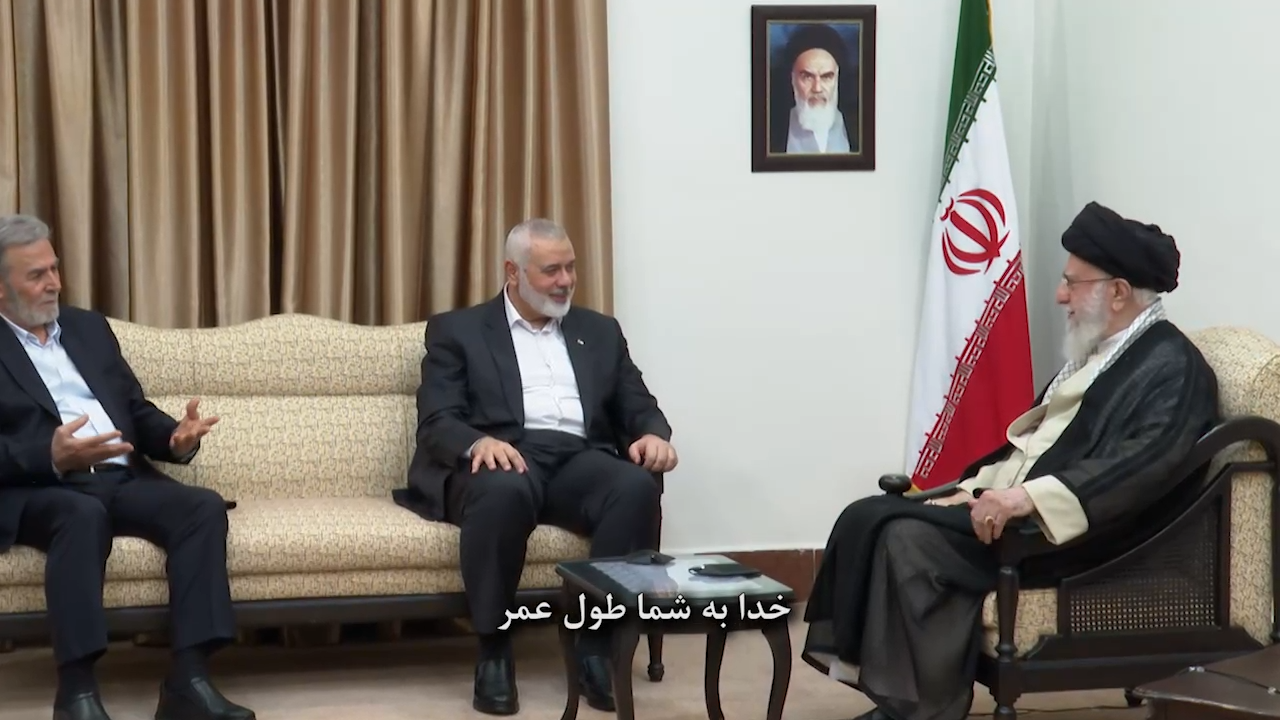 بث التلفزيون الإيراني لقطات للقاء رئيس المكتب السياسي إسماعيل هنية مع المرشد الأعلى في إيران علي خامنئي يوم أمس الثلاثاء قبل اغتياله في مقر إقامته بطهران.