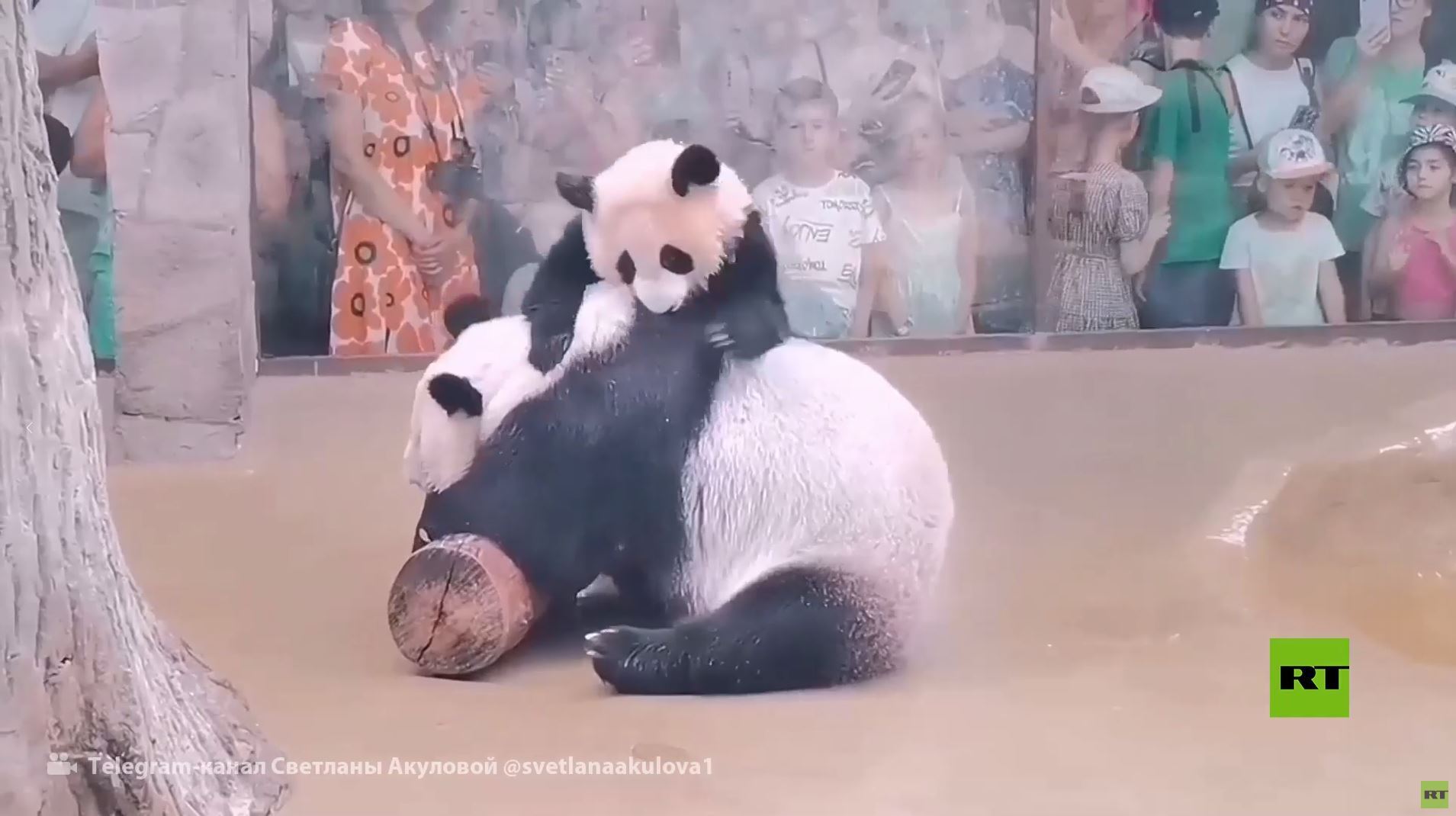 تلعب الباندا "كاتيوشا" مع والدتها في حظيرة حديقة موسكو، وهي تزداد نضجا وقوة يوما بعد يوم.
