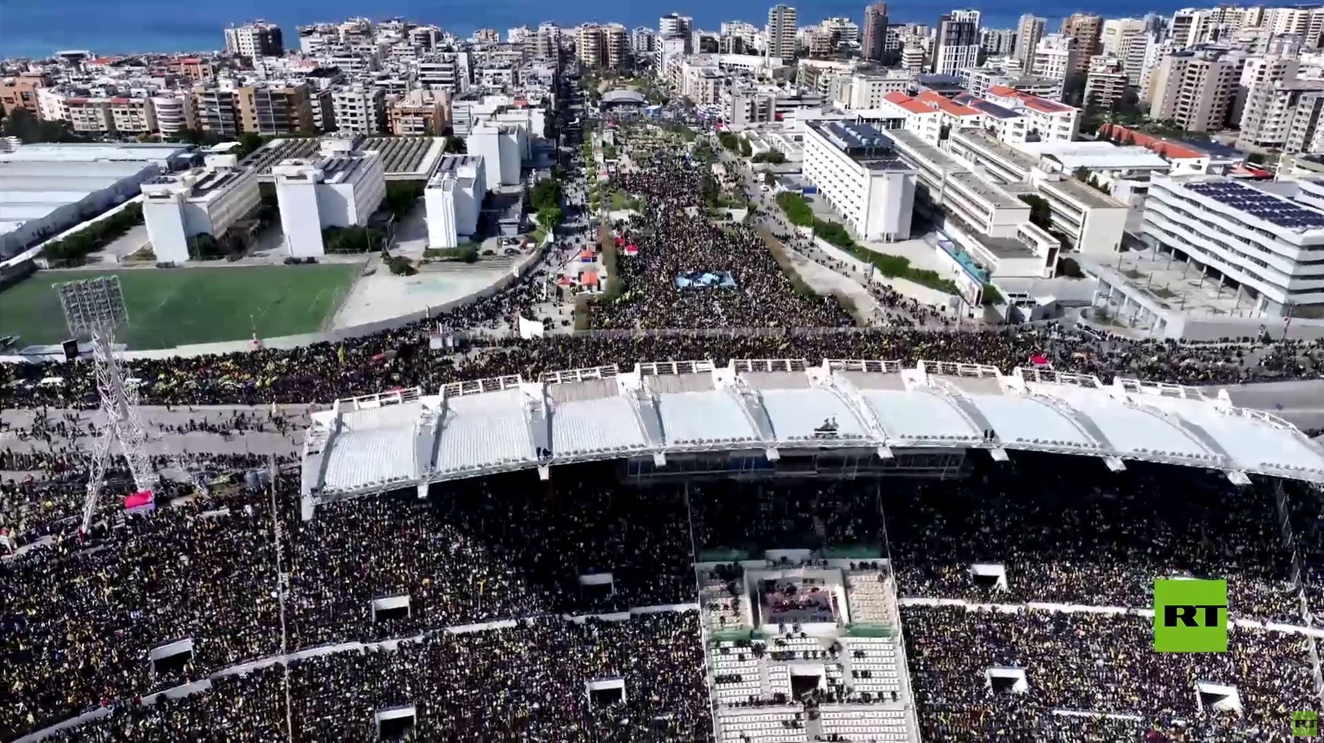 مشاهد جوية متداولة تظهر امتلاء مدرجات المدينة الرياضية في العاصمة اللبنانية بيروت بالمشاركين في تشييع الأمينين العامين السابقين لـ"حزب الله"، حسن نصر الله وهاشم صفي الدين.