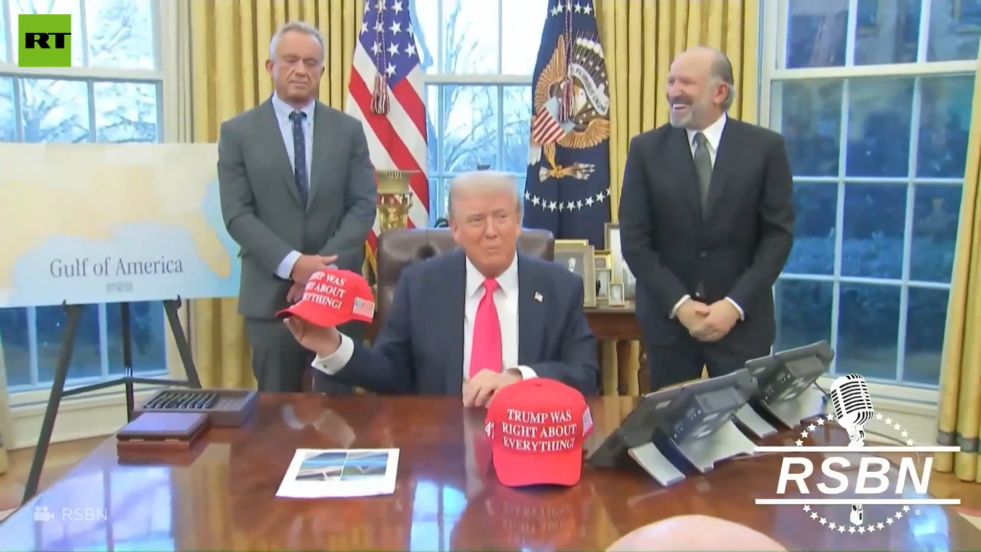 وخلال لقائه مع الصحفيين في المكتب البيضاوي، سلم موظفو الإدارة الزعيم الأمريكي مجموعة من القبعات، والتي عرضها أمام ممثلي وسائل الإعلام.