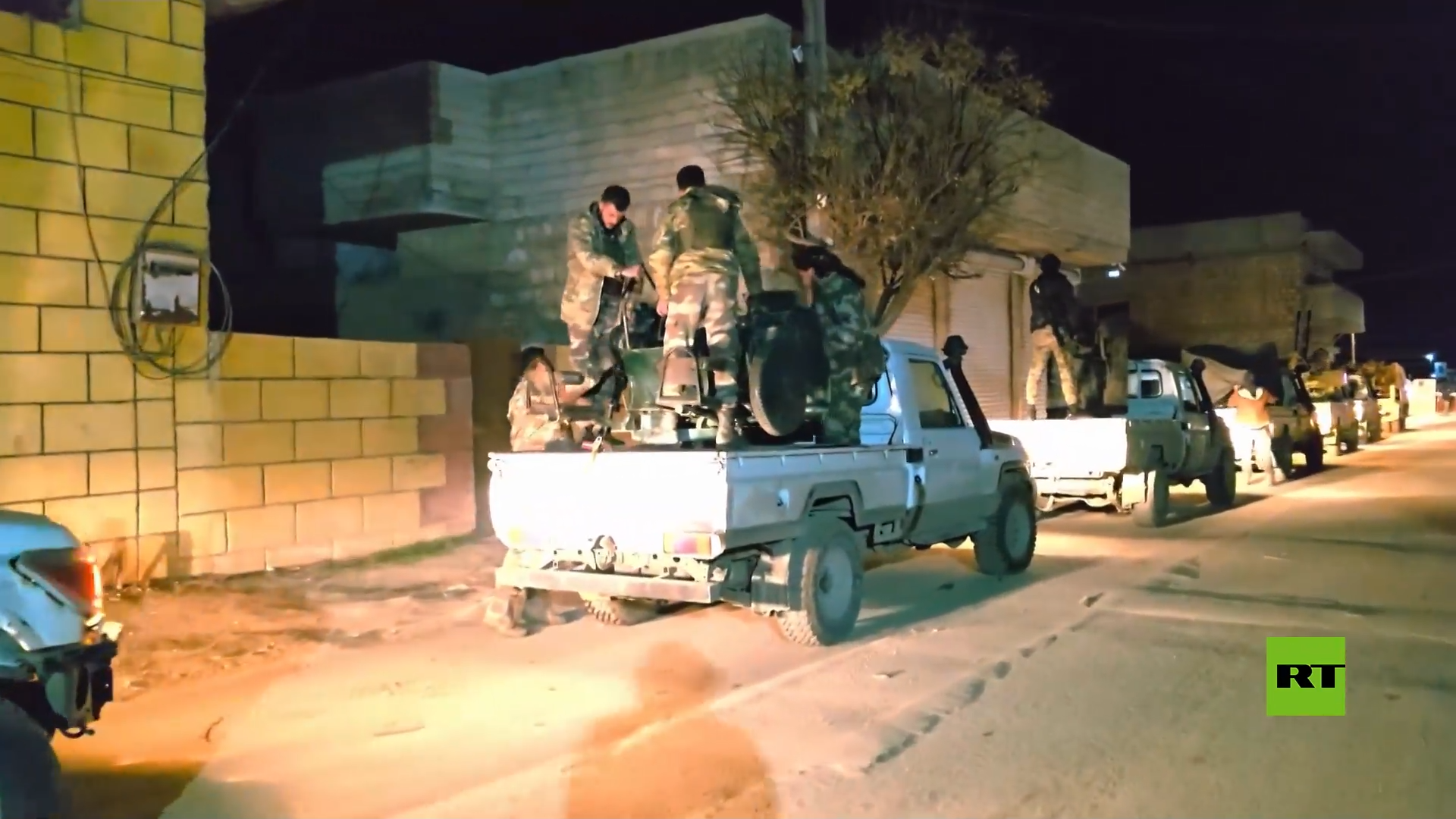وتوثق لقطات عربات عسكرية على متنها أسلحة رشاشة ومتوسطة وثقيلة متوقفة على طريق حلب مع جنود على متنها.