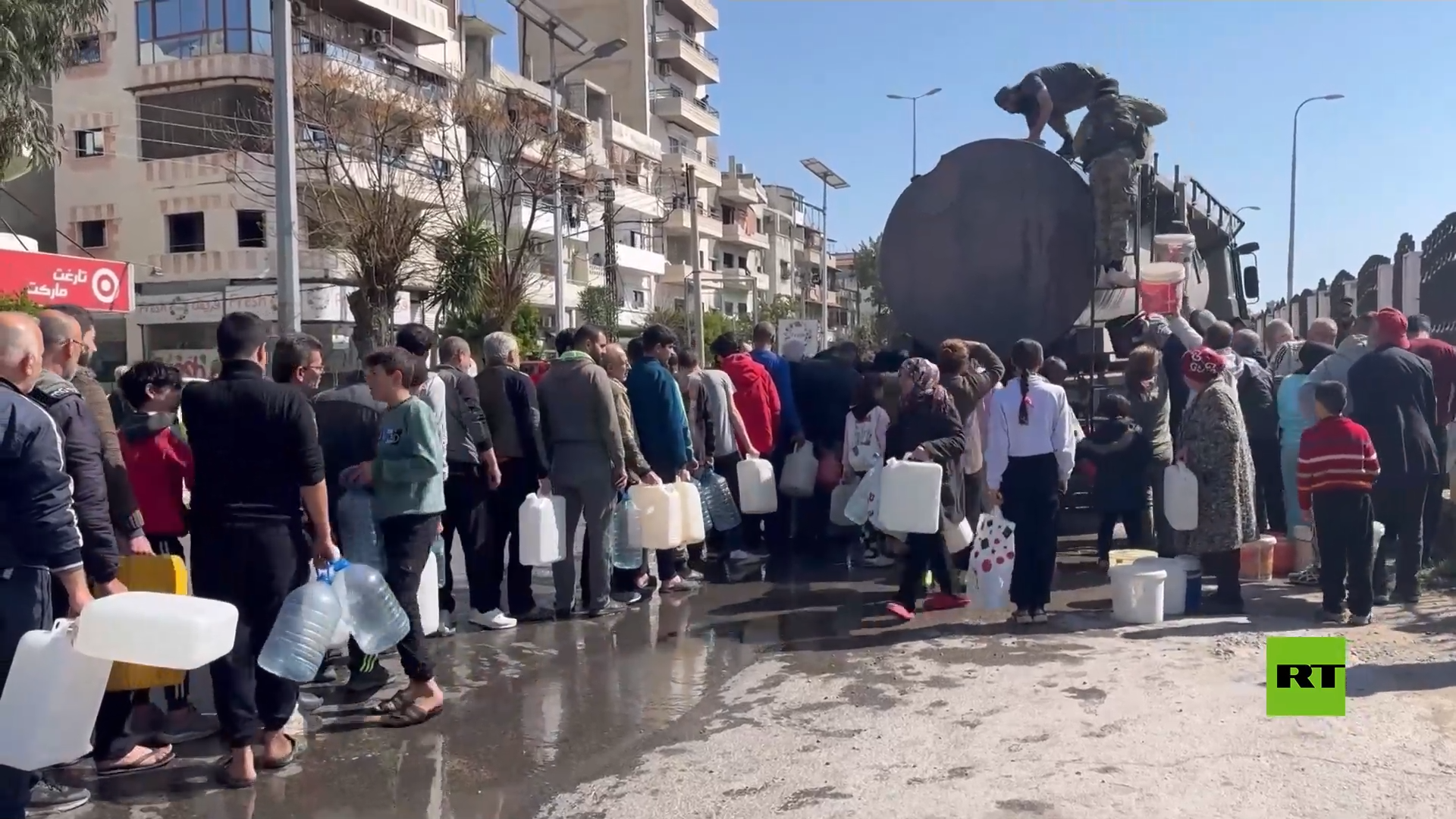 وأظهرت لقطات اصطفاف المواطنين أمام شاحنة المياه لملء دلائهم وحافظاتهم، كما أظهرت لقطات أخرى أفرادا من قوات تابعة للحكومة السورية المؤقتة وهم يقومون بمساعدة الأهالي بتعبئة المياه.