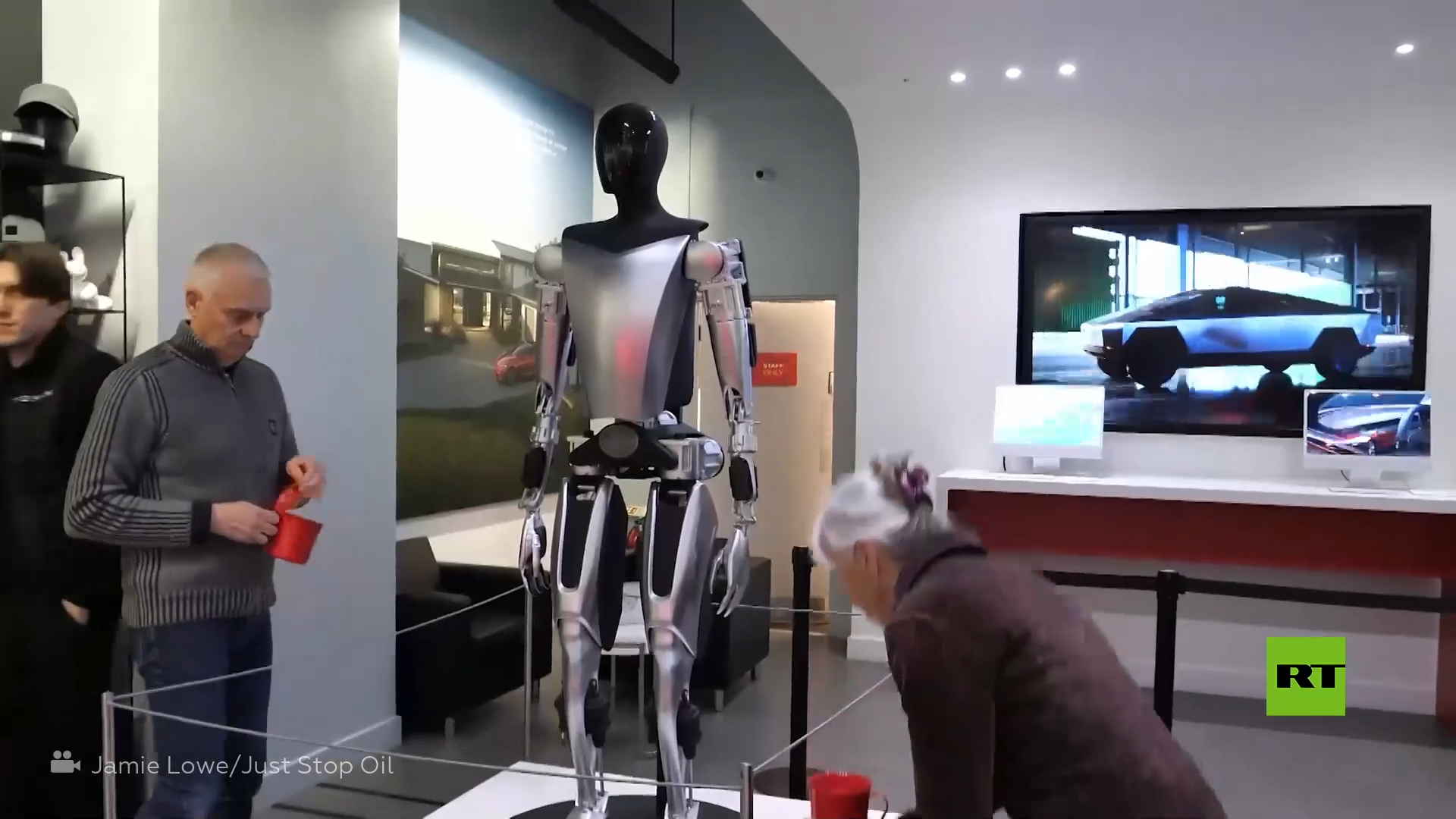 قام ناشطان من منظمة "أوقفوا النفط فقط" بسكب سائل برتقالي على روبوت شبيه بالبشر في أحد متاجر "تسلا" بلندن احتجاجا على الرئيس التنفيذي للشركة ومستشار الرئيس الأمريكي إيلون ماسك.