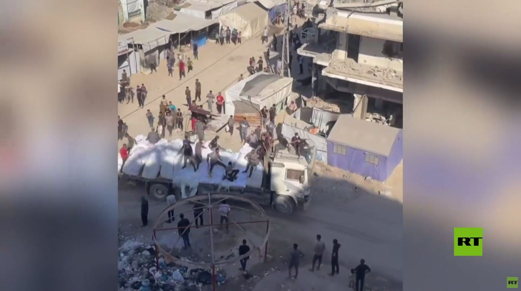 تظهر اللقطات المتداولة اليوم لحظة دخول عدد كبير من الشاحنات المحملة بالطحين إلى شمال قطاع غزة.