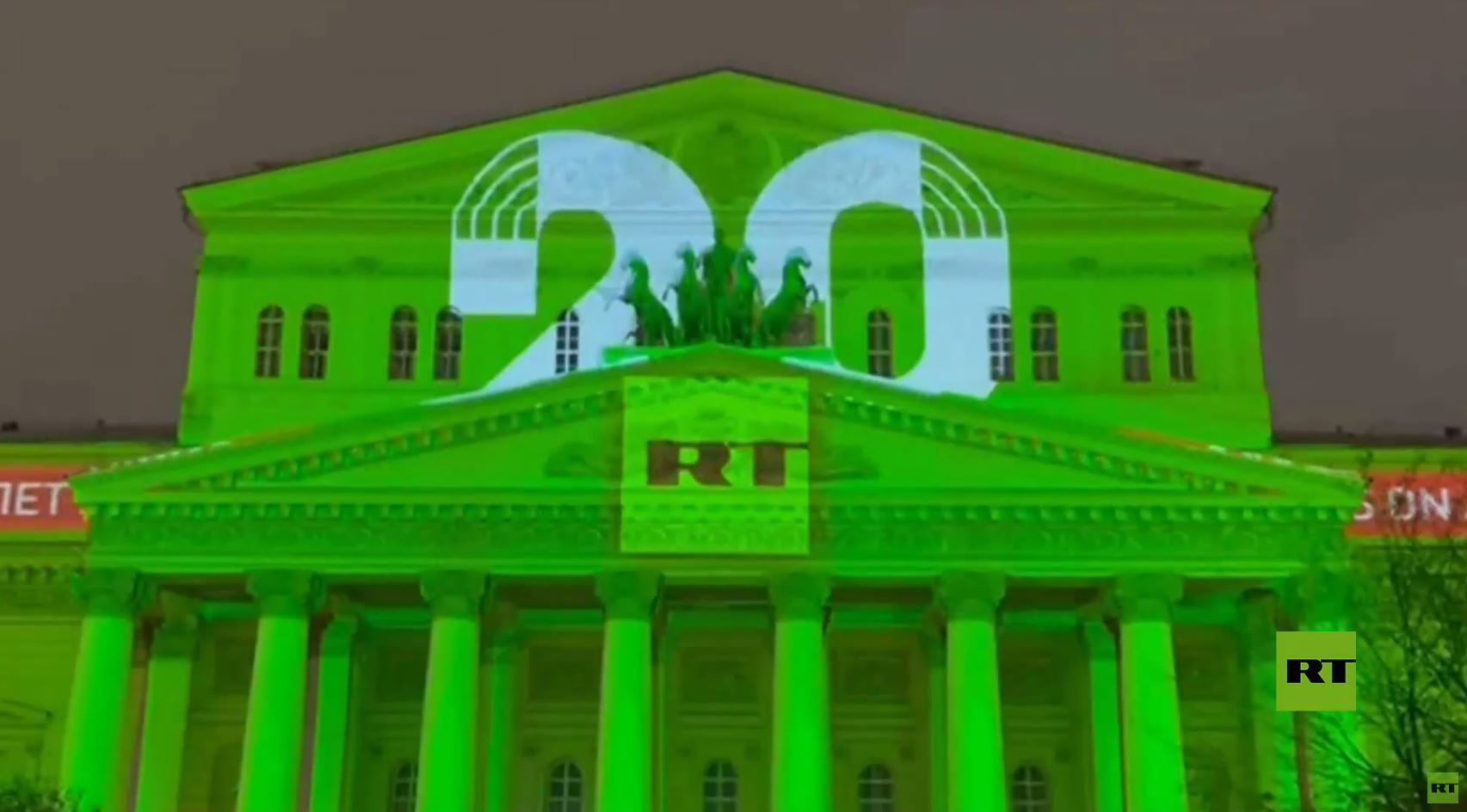 تزينت واجهة المسرح الكبير في العاصمة الروسية موسكو بالإضاءة الخضراء، مع عرض شعار قناة "آر تي"، احتفالًا بالذكرى العشرين لتأسيس القناة.