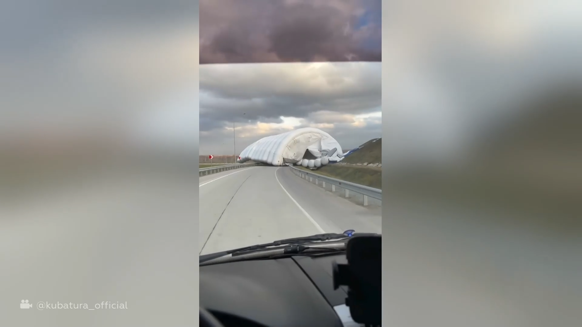 سجل سائق سيارة لقطات لخيمة ضخمة قابلة للنفخ تطير على أحد الطرق السريعة في نوفوسيبيرسك الروسية وتعرقل حركة المرور، وذلك بسبب رياح سيبيرية تجتاح المدينة منذ بضعة أيام.