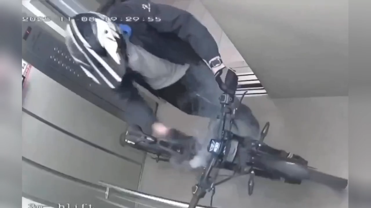 ويوثق الفيديو المنشور راكب الدراجة يدخل إلى المصعد مع معداته، فيما يتصاعد الدخان منها فجأة ثم تشتعل فيها النيران.