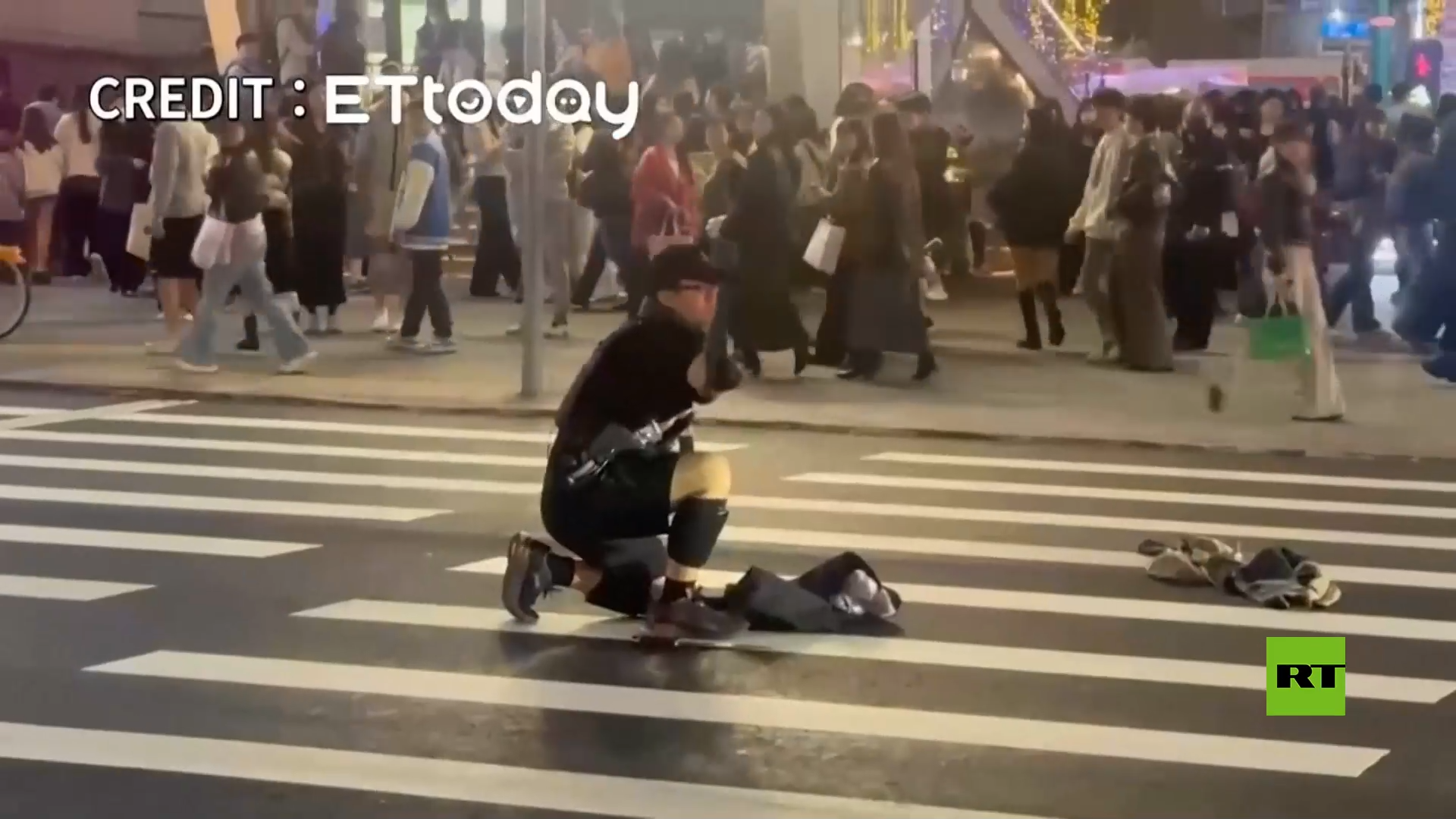 توثق لقطات من العاصمة التايوانية شخصا يرتدي قميصا أسود وقبعة يلقي قنابل دخانية على المشاة ثم يستل سكينا ويتجه نحو الناس ويهاجمهم.