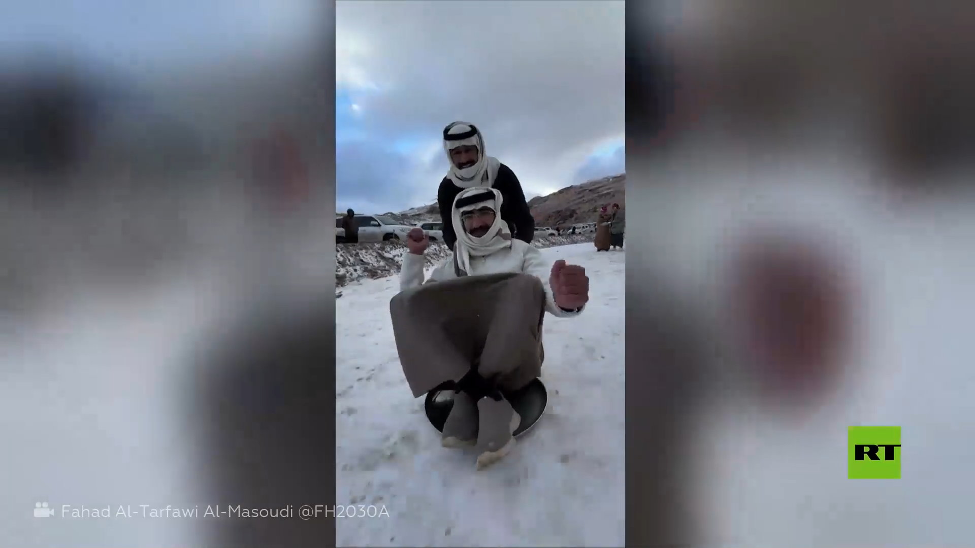 سعوديون يستمتعون بتساقط الثلوج في جبل اللوز
