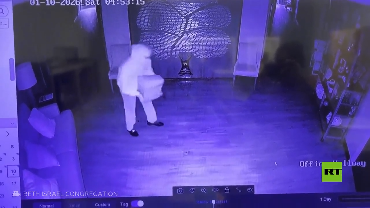 نشرت جماعة بيت إسرائيل لقطات من كاميرات المراقبة توثق رجلا ملثما يرتدي غطاء رأس، يستخدم عبوة بنزين لسكب سائل على أرضية وأريكة في ردهة المعبد اليهودي بولاية مسيسيبي الأمريكية.