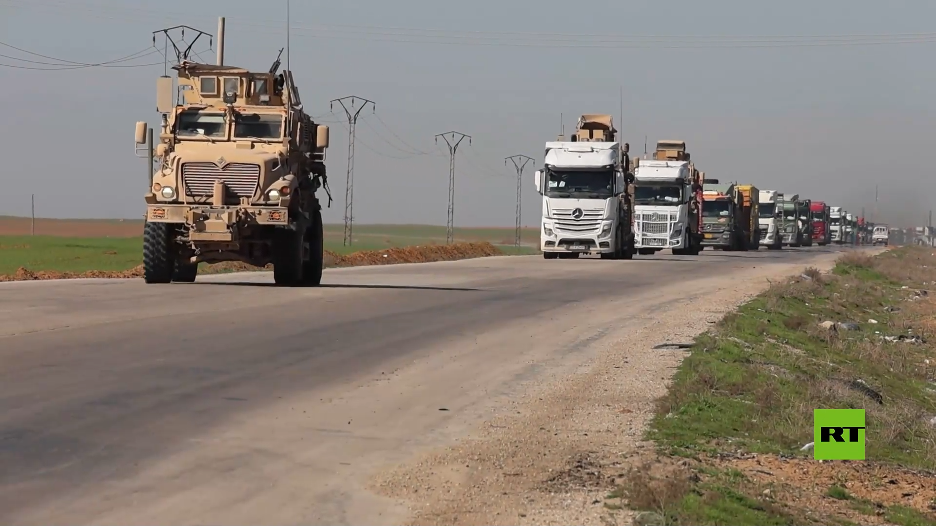 وتبين اللقطات الموكب المكون من مركبات وشاحنات تحمل مدرعات وعتادا عسكريا يسير على الطريق الدولي "أم 4" جنوب مدينة القامشلي في ريف محافظة الحسكة.