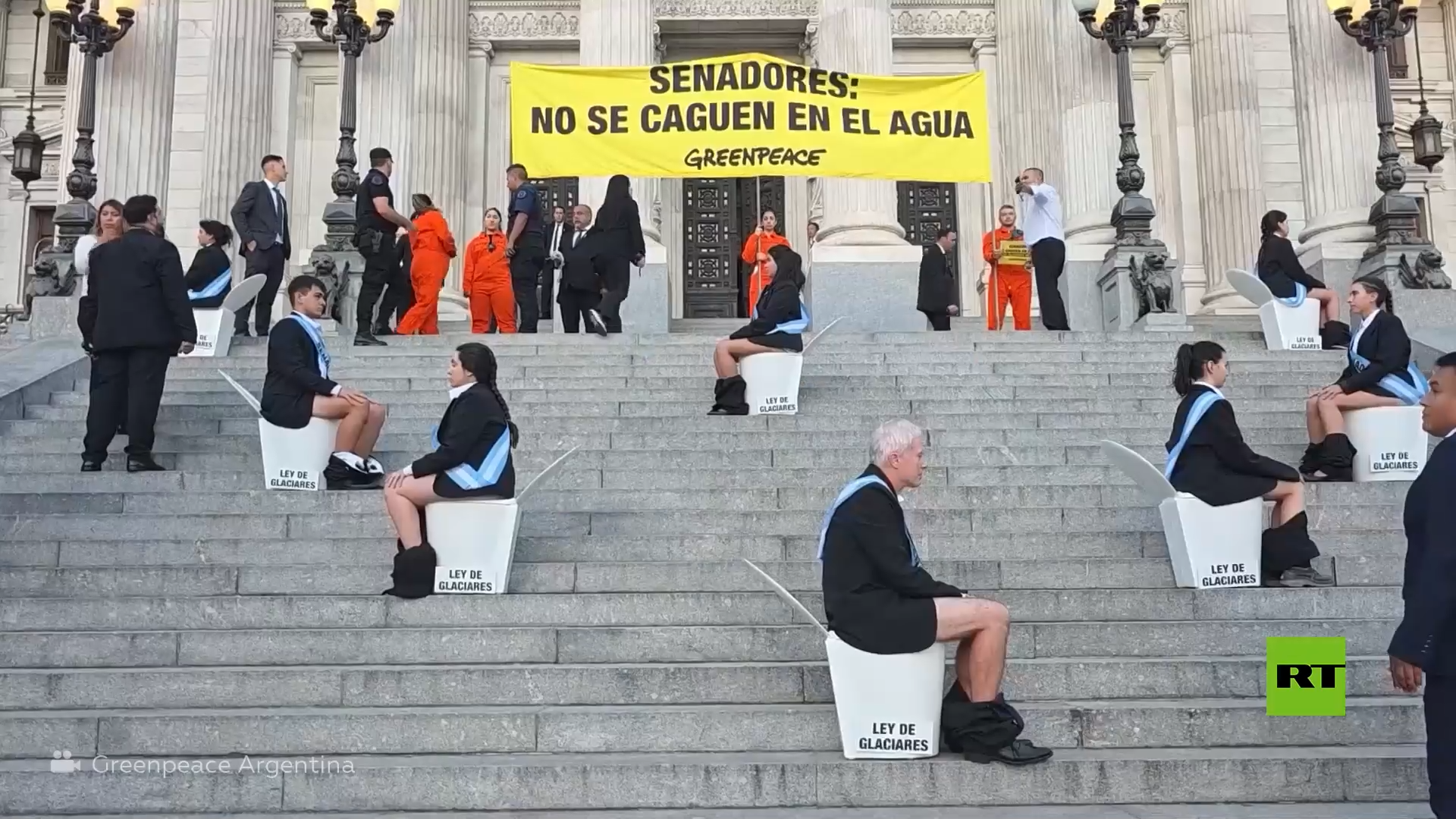 وتجمع النشطاء أمام مبنى الكونغرس مرتدين بدلات رسمية، في إشارة إلى المشرعين، جالسين على المراحيض حاملين لافتات كتب عليها: "قانون الأنهار الجليدية". كما رفعوا لافتة كتب عليها: "أيها السادة أعضاء مجلس الشيوخ: لا تُلوثوا المياه".