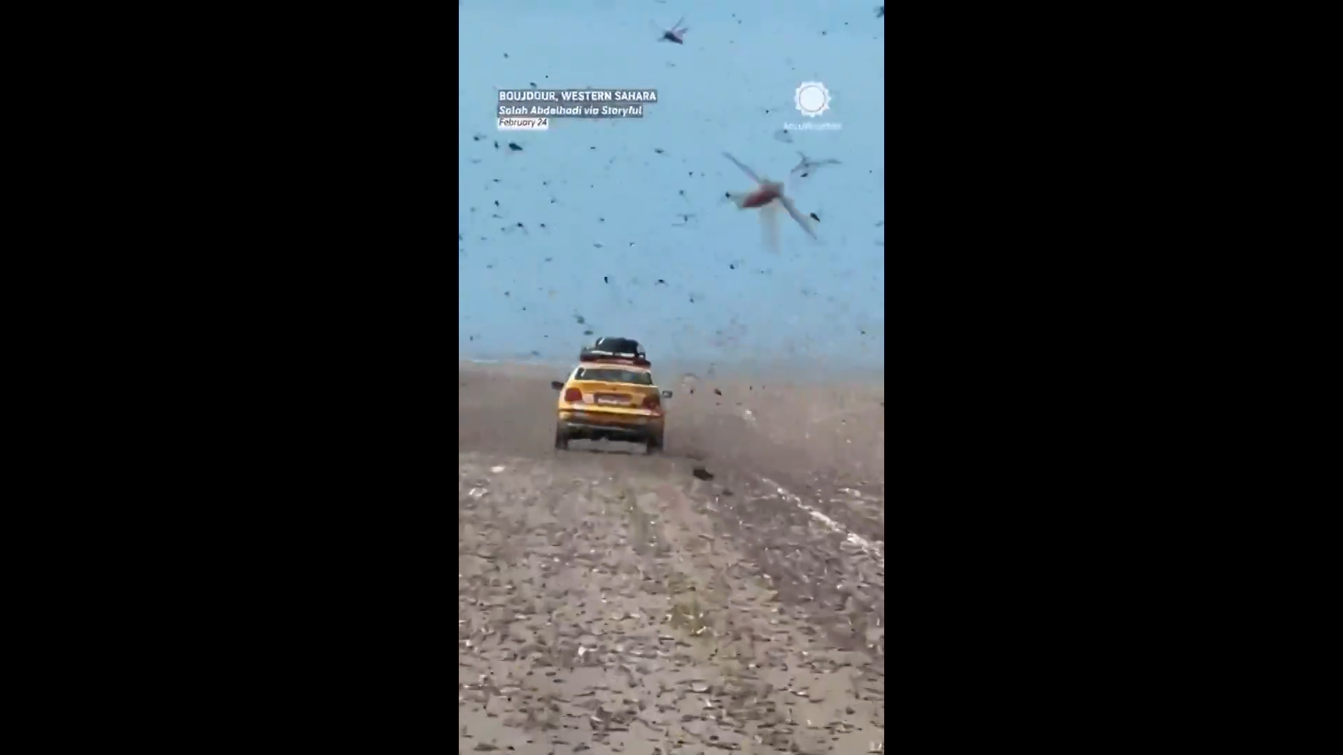 غطت أسراب ضخمة من الجراد سماء وأرض وطرق مدينتي طرفاية وبوجدور جنوب المغرب في حادث يصفه السكان المحليون بأنه "نادر" في المنطقة.