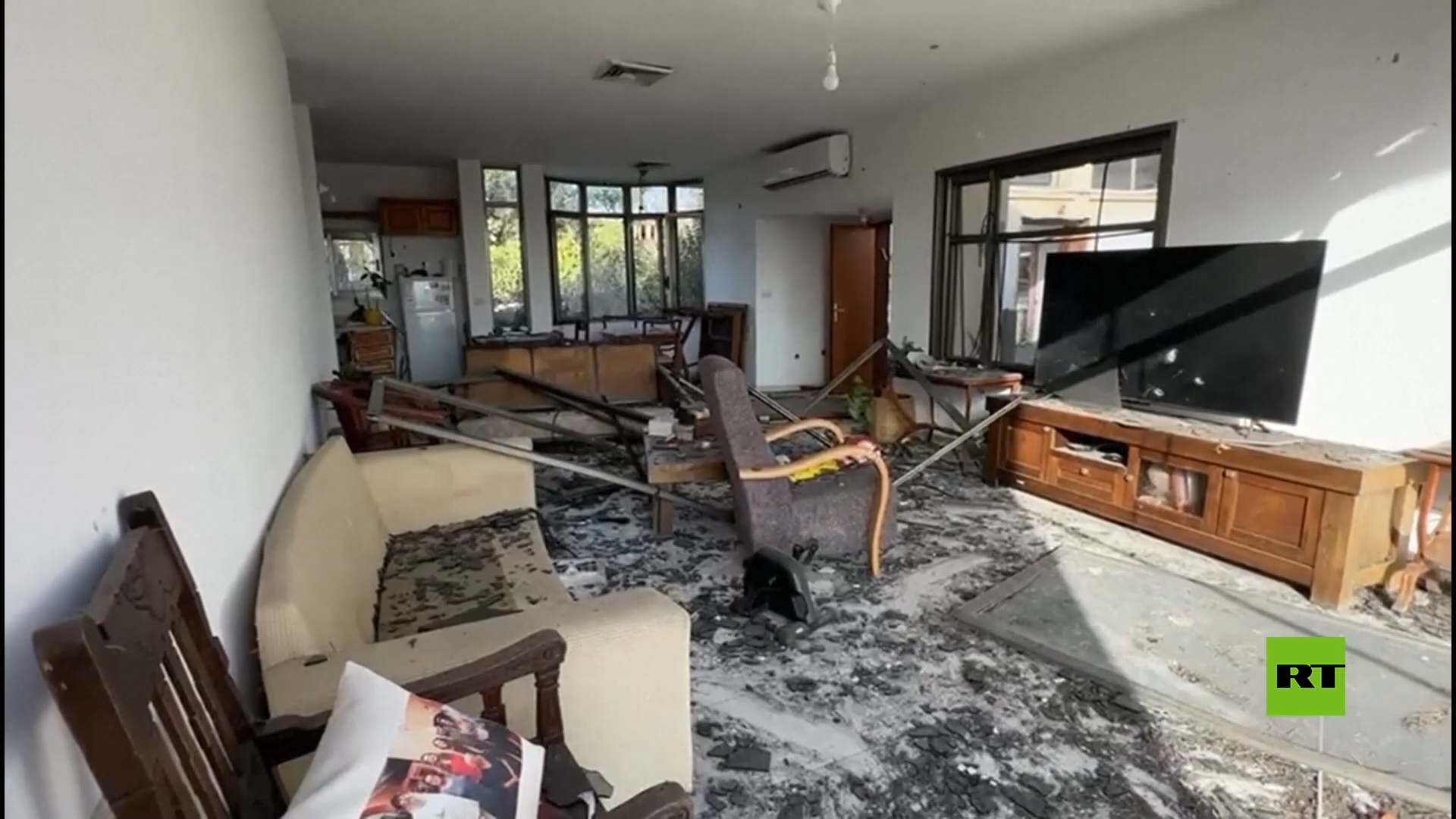 ألحق صاروخ أطلقه حزب الله اللبناني أضرارا بمنزل في هانيل، شمال إسرائيل، مخلفا حفرة كبيرة خارج المنزل وتناثر الحطام حوله.