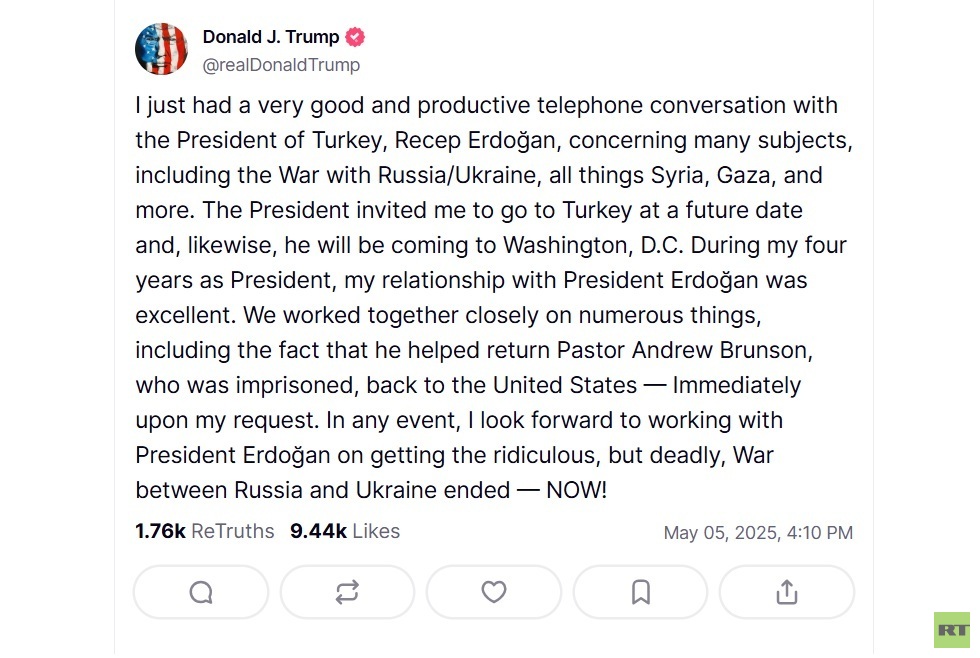 وأفاد ترامب في التدوينة: "أجريت للتو محادثة هاتفية مثمرة للغاية مع الرئيس التركي رجب أردوغان، تناولت مواضيع عديدة، منها الحرب مع روسيا وأوكرانيا، وسوريا وغزة، وغيرها".