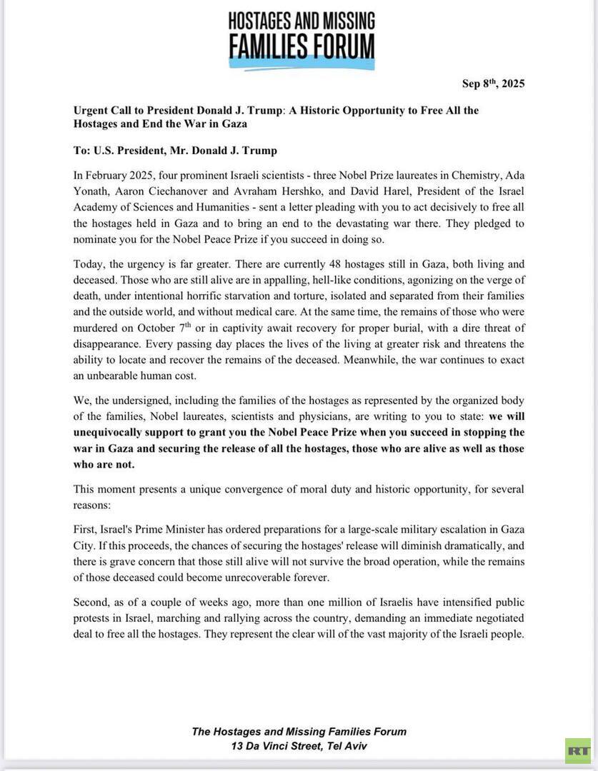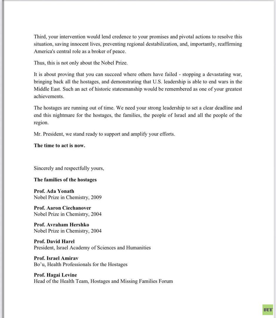 وكررت عائلات الرهائن نداءها لترامب: "في فبراير 2025، أرسل أربعة علماء إسرائيليين بارزين ثلاثة منهم حائزون جائزة نوبل في الكيمياء هم آدا يوناث، وآرون تشيخانوفر، وأبراهام هيرشكو، وديفيد هاريل، رئيس الأكاديمية الإسرائيلية للعلوم والإنسانيات، رسالة يتوسلون إليك فيها للتحرك بحزم لتحرير جميع الرهائن المحتجزين في غزة وإنهاء الحرب المدمرة هناك. وتعهدوا بترشيحك لجائزة نوبل للسلام إذا نجحت في ذلك".
