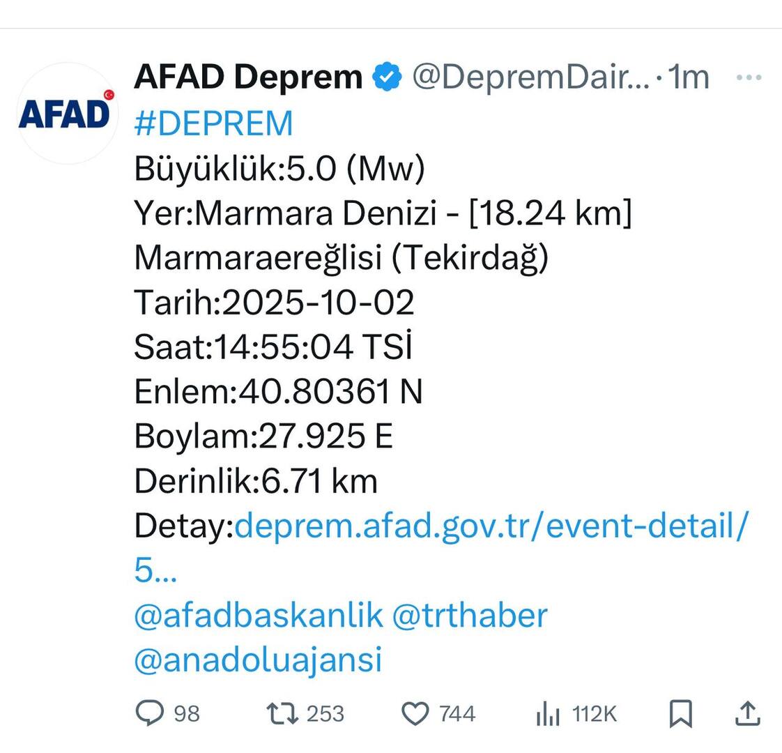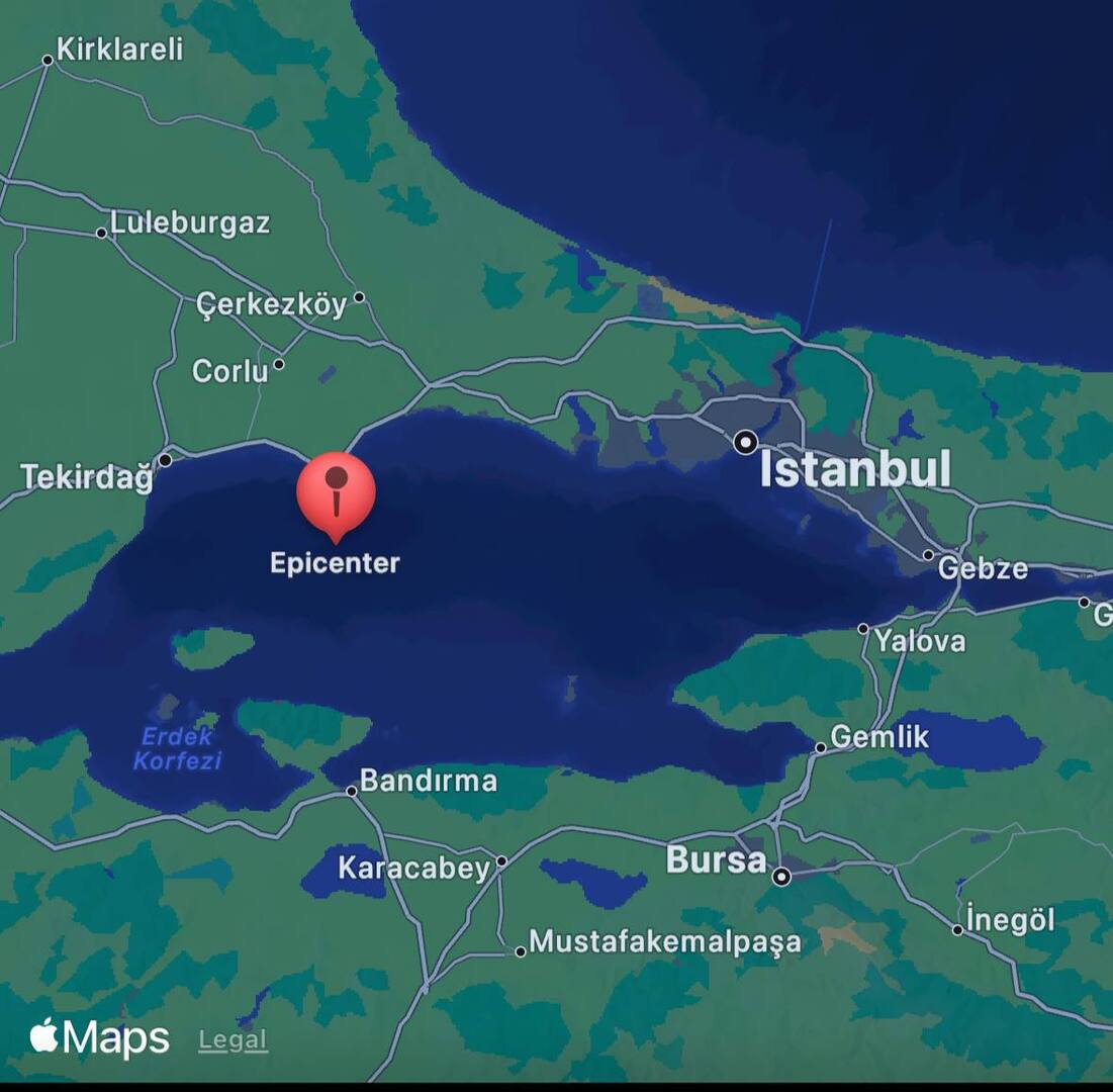 ووفق إدارة الكوارث في تريكا "أفاد" فإن موقع الهزة وقع قرب ساحل ولاية تيكيرداغ المحاذية لبحر مرمرة، على عمق 6.71 كيلومترات في بحر مرمرة.