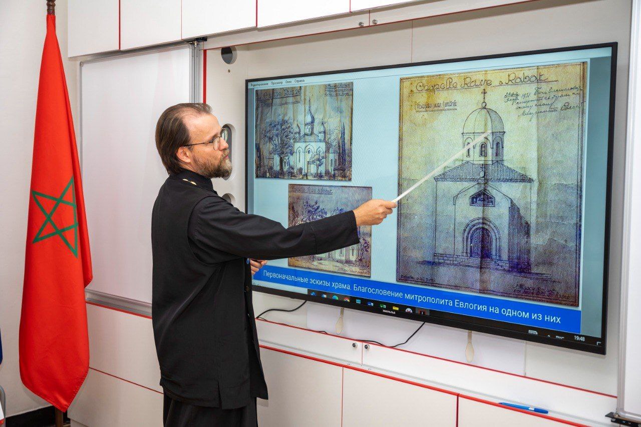 في مداخلته، تحدّث الأب مكسيم عن تاريخ "الكنيسة الأرثوذكسية الروسية في المغرب"، إحدى أولى المؤسسات التي أسسها الروس في البلاد، والتي سيُحتفل بمرور مائة عام على تأسيسها عام 2027. كما عرّف الحضور بتاريخ كنيسة القيامة في الرباط، التي تعدّ أقدم كنيسة روسية في إفريقيا، وبيّن دور الرعية في الحفاظ على ذكرى الجالية الروسية وتوثيق أسماء الأرثوذكس الروس المدفونين في مقابر المغرب.