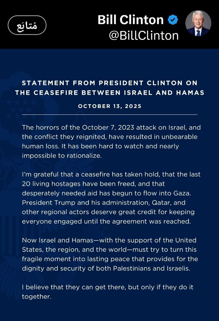 وكتب كلينتون على منصة "إكس": "يستحق الرئيس ترامب وإدارته وقطر وغيرهم من الأطراف الإقليمية تقديرا كبيرا لجهودهم في إبقاء الجميع منخرطين حتى التوصل إلى الاتفاق".