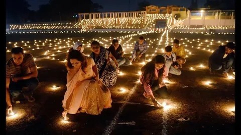 وتبلغ الاحتفالات ذروتها بإشعال مصابيح "ديا" الطينية، التي ترمز إلى اتحاد الجسد والعقل والروح — إذ يمثل الطين الجسد الفاني، والزيت العقل والمعرفة، واللهب الروح الأبدية المنتصرة على الجهل.