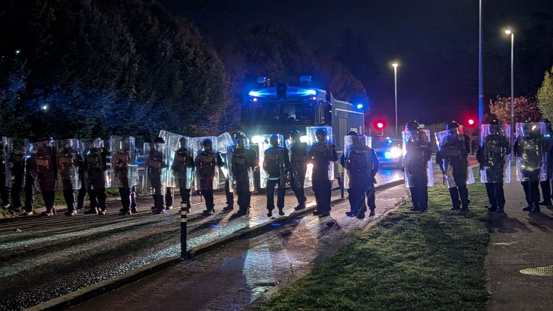 ووفقا لقناة "RTÉ" التلفزيونية المحلية، تجمع حوالي 2000 شخص، وبدأت الشرطة بتفريقهم، فيما أظهرت لقطات من موقع الحادث سيارة شرطة مشتعلة، بالإضافة إلى عدد من المتظاهرين يرفعون الأعلام.