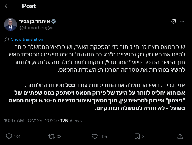 وأضاف: "أذكر رئيس الوزراء بالتزامه بتحقيق جميع أهداف الحرب، إذا قرر التخلي عن هدف تفكيك حماس، واكتفى بالشعارات الظاهرية بتفكيكها، مع استمراره في الحفاظ على سياسة 6.10 ووجود حماس عمليا، فلن يكون للحكومة أي حق في الوجود".