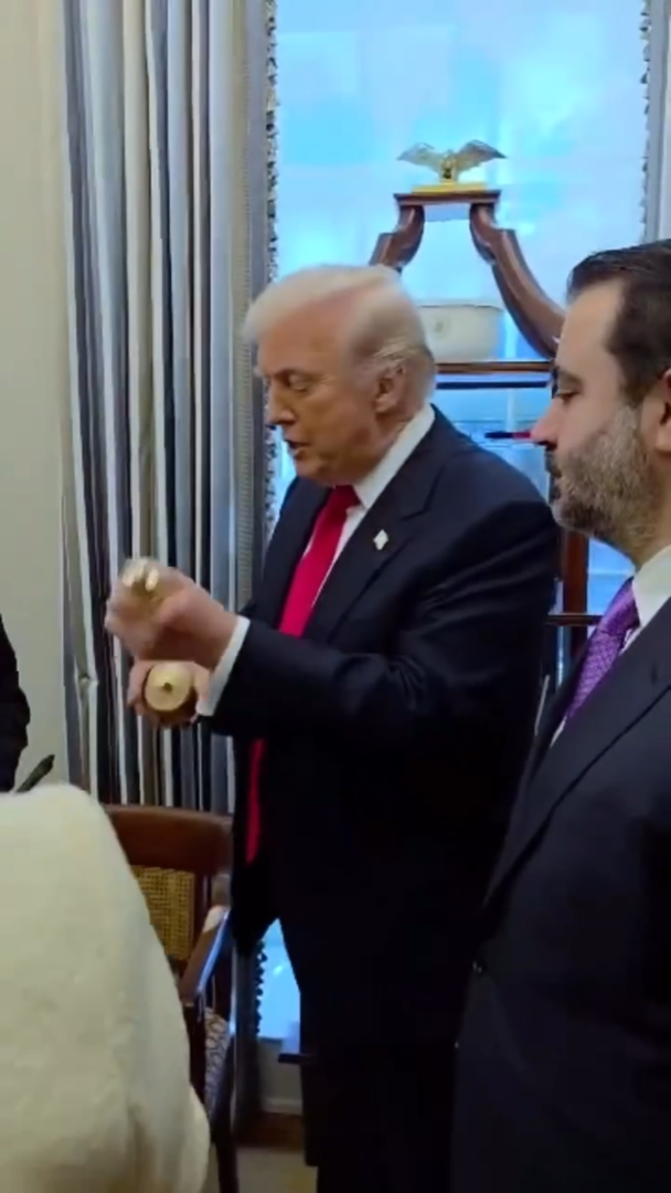 انتشر مقطع فيديو للرئيس الأمريكي دونالد ترامب وهو يقوم برش عطره الخاص على الرئيس السوري أحمد الشرع ووزير الخارجية أسعد الشيباني.