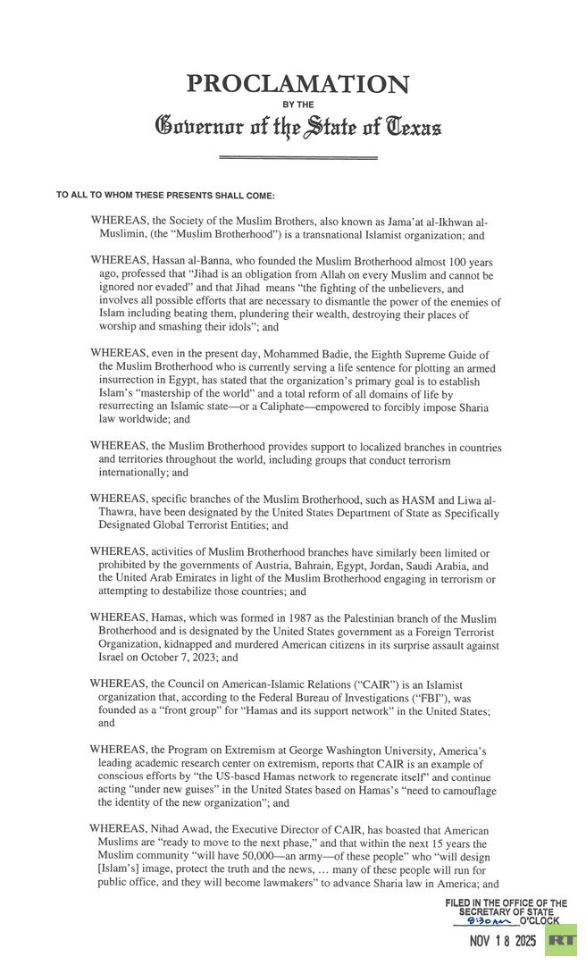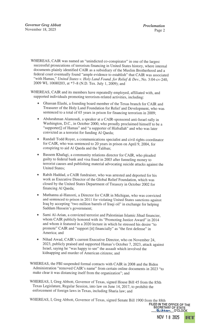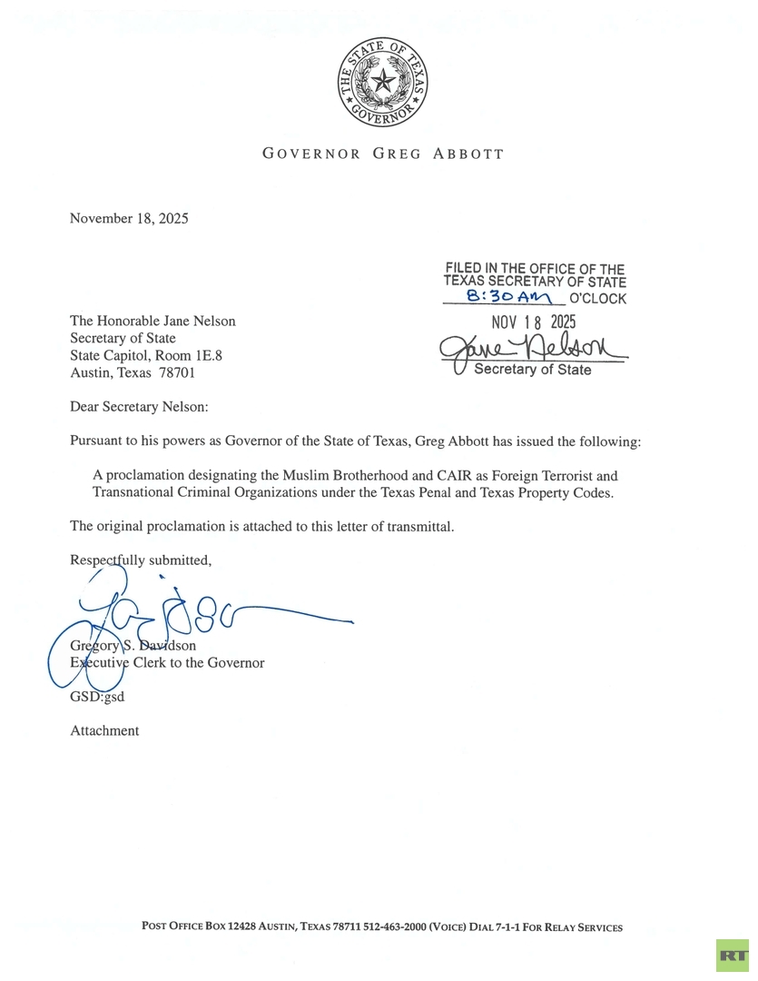 صنف حاكم ولاية تكساس الأمريكية الجمهوري غريغ أبوت، جماعة "الإخوان المسلمين" و"مجلس العلاقات الأمريكية الإسلامية" (كير)، منظمات إرهابية أجنبية ومنظمات إجرامية عابرة للحدود الوطنية.