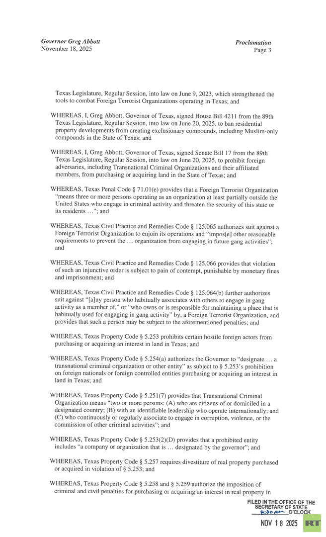 ويسمح هذا التصنيف "بتشديد الإجراءات" ضد المنظمتين والشركات التابعة لهما ويمنعهما من شراء أو استحواذ الأراضي في تكساس، وفقا لمكتب أبوت.