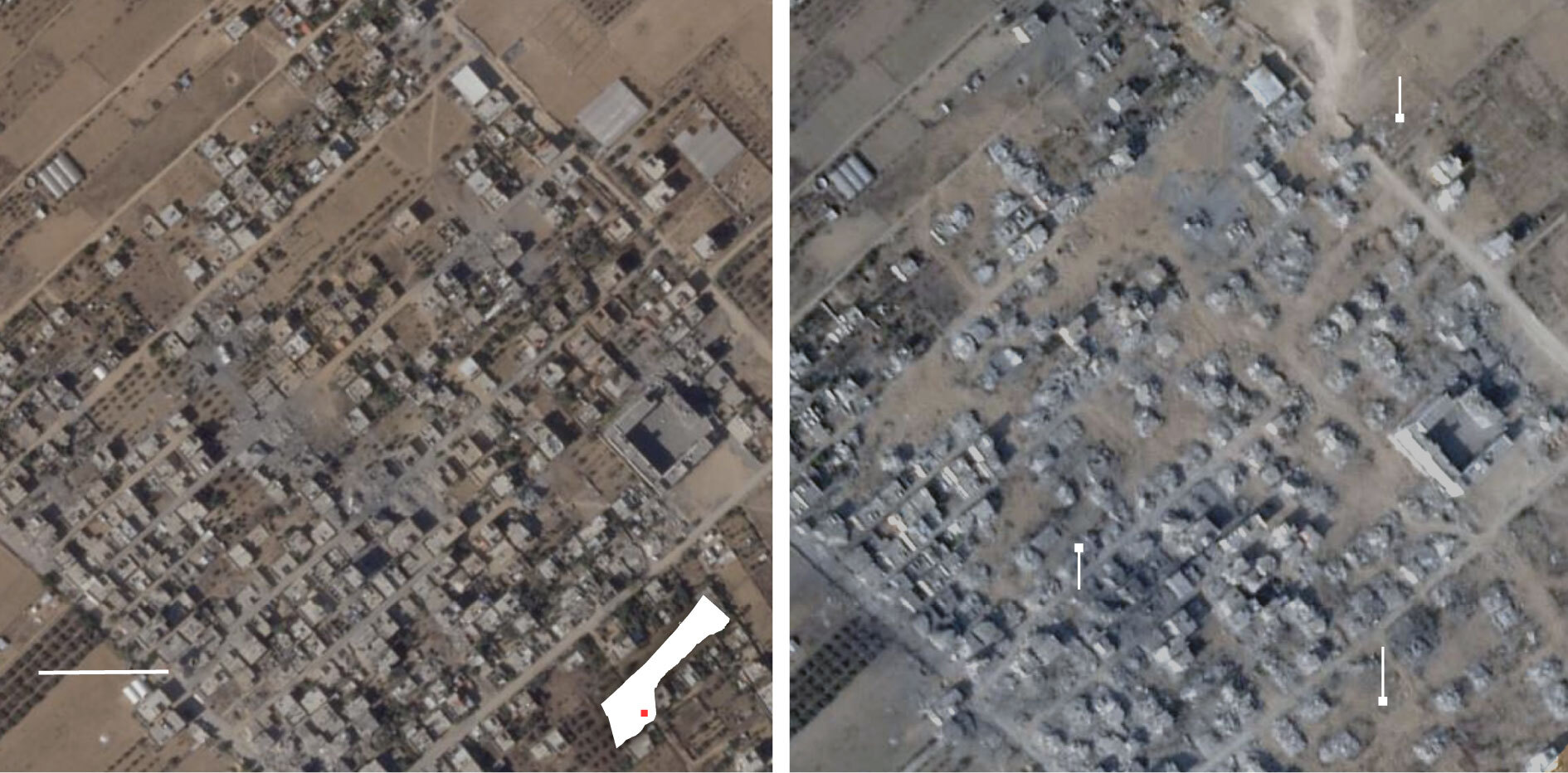 وفي صور الأقمار الصناعية الملتقطة بعد فترة وجيزة من الهدنة، تَظهر تجمعات من المباني السليمة في حي الشجاعية، الذي يمتد على طول الخط الأصفر، بعد أشهر وثقت صور للمنطقة نفسها كيف تحولت إلى أرض قاحلة في معظمها.